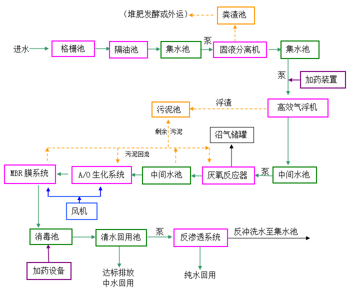 動物屠宰加工過程中將產(chǎn)生一定量的廢水,廢水主要來自動物屠宰后清洗、解體沖洗、內(nèi)臟清洗和地面沖洗以及糞便廢水等廢水。廢水中含有大量的有機物質(zhì),主要成分:動物糞便、血液、動物內(nèi)臟雜物、動物體毛、碎皮肉和油脂等有機物,屬于高濃度有機廢水。廢水呈褐紅色,具有較強的腥臭味。這些廢水中的脂肪、蛋白質(zhì)等物質(zhì)不經(jīng)過處理,直接排入水體,將對其周圍水體造成嚴重富營養(yǎng)化,嚴重破壞水體的自盡能力,造成水體發(fā)黑變臭,影響環(huán)境和農(nóng)業(yè)灌溉。